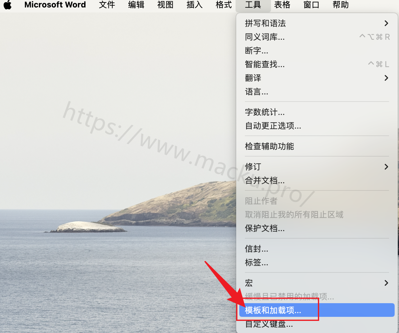33.打开左上角菜单栏的【工具】,打开【模板和加载项…】