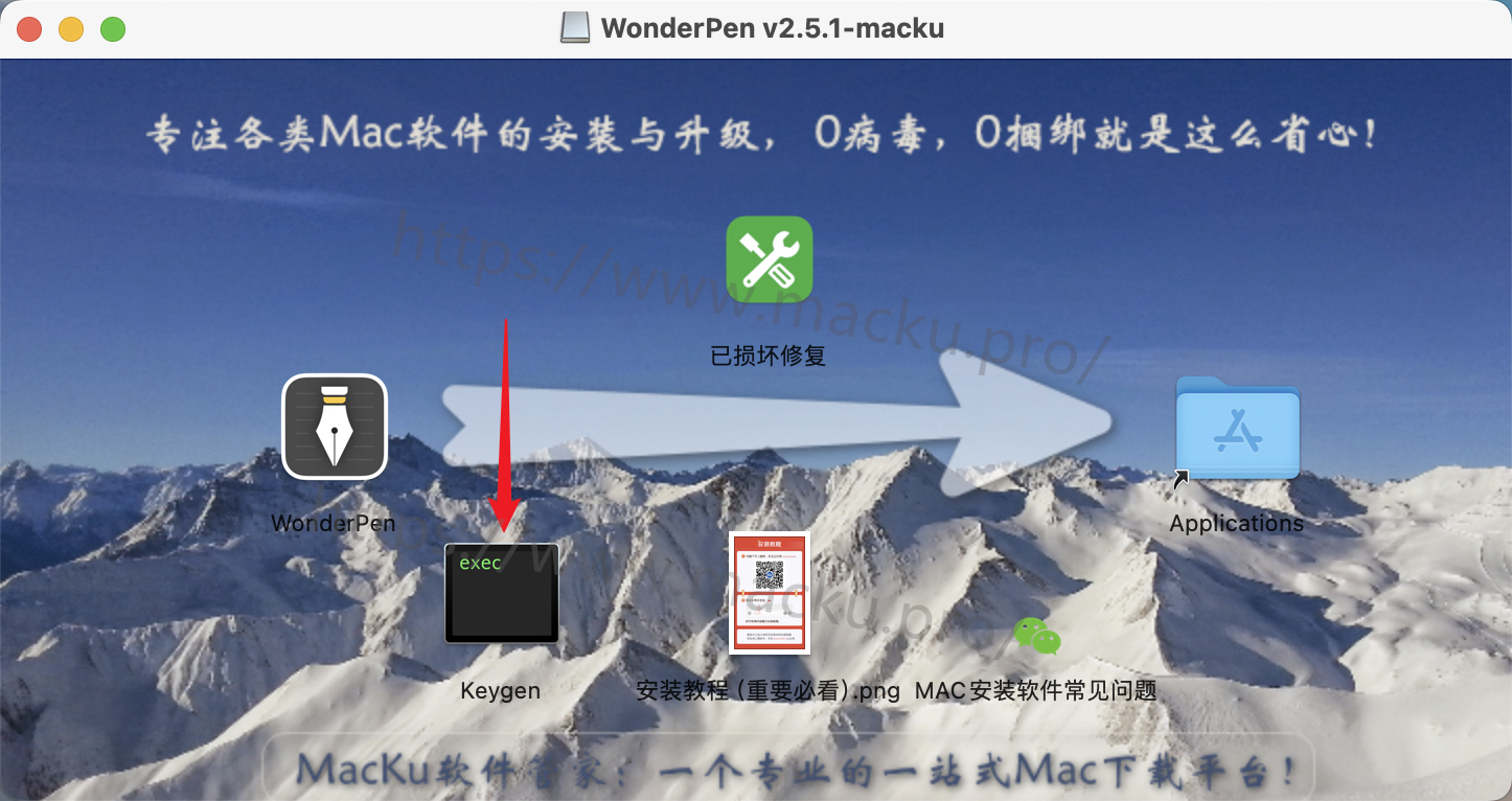 2.拖动左侧的【WonderPen】至右侧的【Applications】文件夹内,自动安装