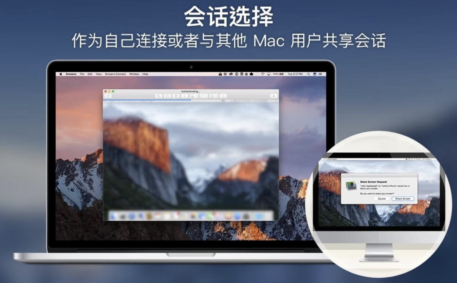 作为自己连接或者与其他 Mac 用户共享会话。